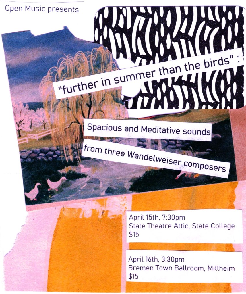 A collaboration between Open Music, Julia Kasdorf (poet), Pearl Gluck (filmmaker), Bruce Trinkley (composer) and James Kalsbeek (set design and host)